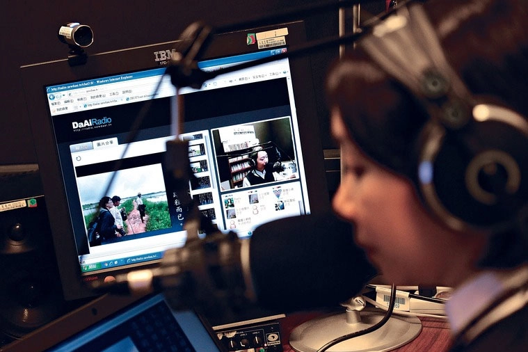 透過視訊畫面,大愛網路電台現場節目主持人,分享各地慈濟志工回傳的簡報圖檔,聽眾在「聊天室」不聊天,而是見善隨喜,妙法學習。(攝影:顏霖沼)