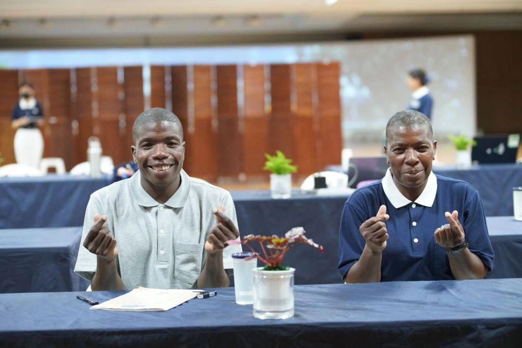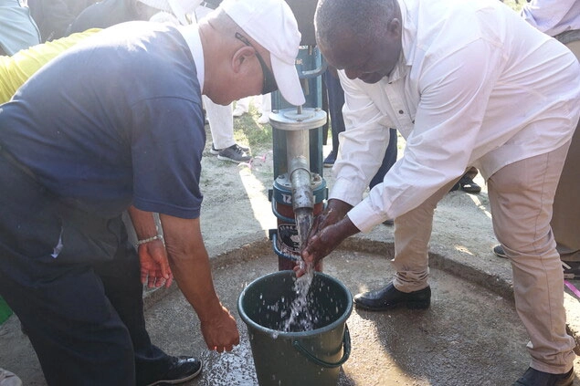慈濟志工前往馬斯溫戈省鄉村掘井、安裝手壓幫浦,完工後舉辦啟用儀式並發放大米。Chadzamira部長(右)與朱金財師兄(左)開心使用新井淡水。(2022/11/16;圖片來源:辛巴威聯絡處提供)