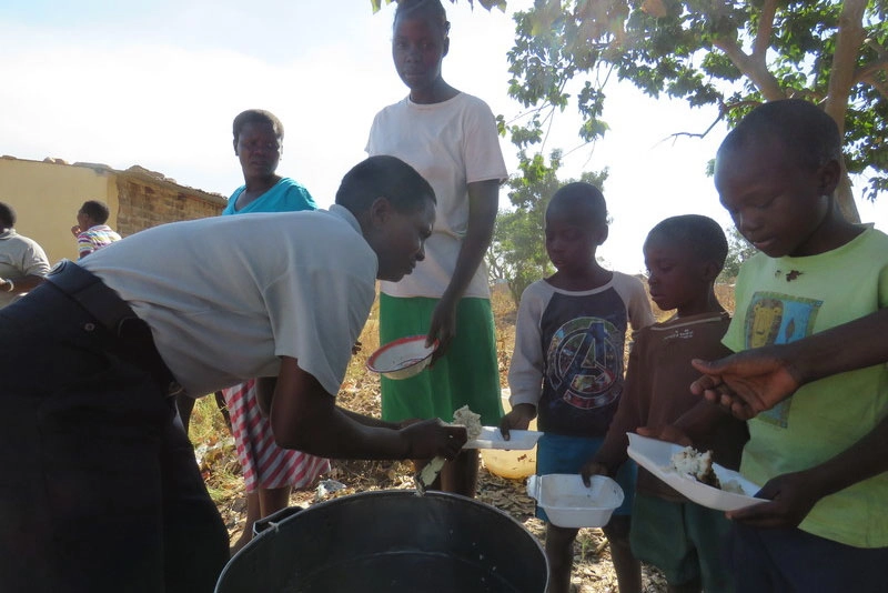 辛巴威哈拉雷艾普沃斯水井修繕工程,因修繕工程耗時,志工準備香積飯做為午齋,也發放一些熱食給附近的孩子們。(攝影:Hlengisile Jiyane)