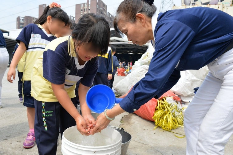 做完環保工作後,慈濟志工用水瓢為小朋友舀水洗手,除了節約用水外,也讓水資源回收再利用。(攝影:陳玉萍)