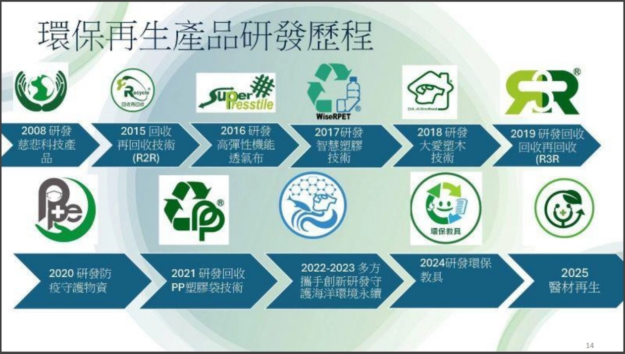 大愛感恩科技自2008年成立以來,持續研發環保素材與創新技術,以清淨智慧守護眾生與地球,讓慈悲與環保理念永續傳承。(圖片來源:擷取自釋德淨簡報)