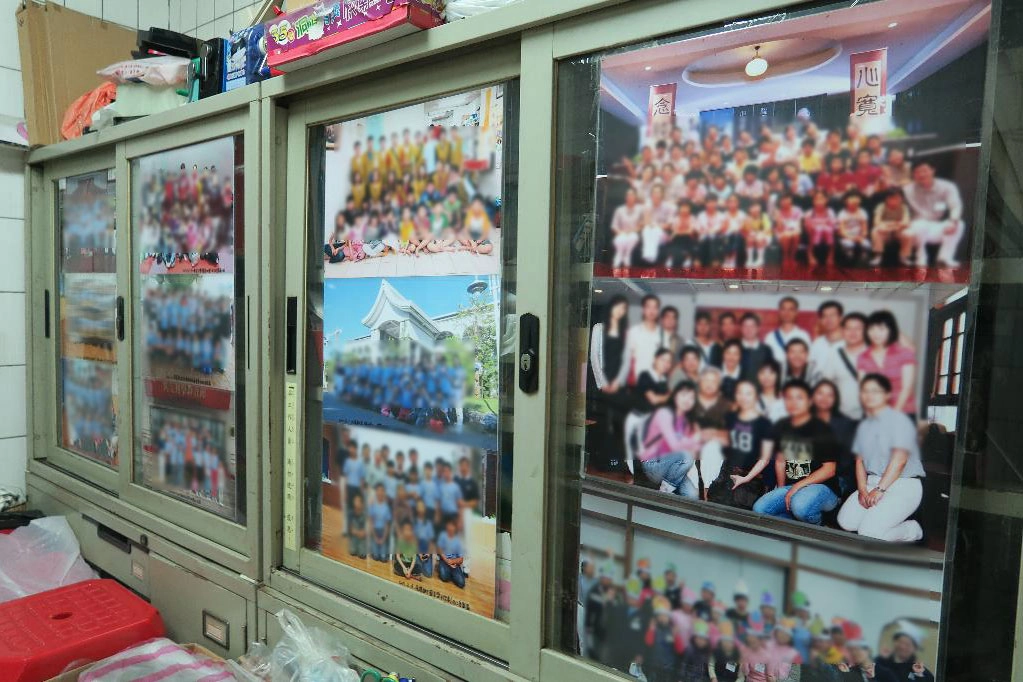 時光倏忽即逝,三重新芽課輔班十個年頭過去,櫃子的牆上一張張的照片,回溯這十年的點點滴滴。(攝影:陳婉婷)