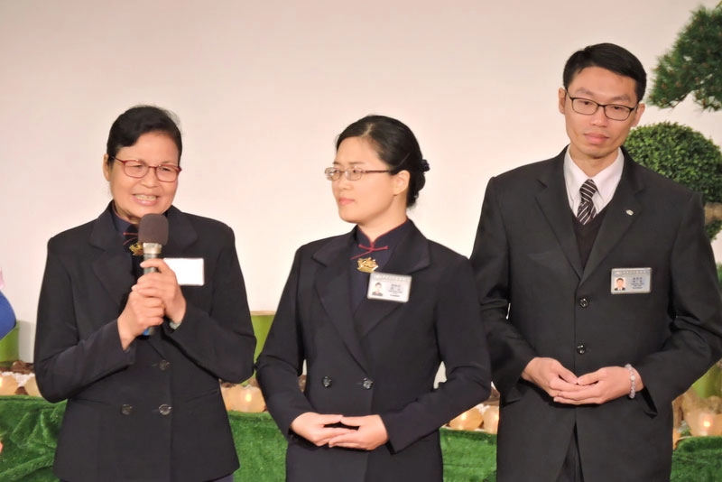 江柑師姊(左一)與新芽課輔班志工上台分享,講述三重區課輔班的緣起與多年陪伴弱勢學童的點滴,並發願持續以愛守護新芽。(2019/11/20;攝影:顏福江)