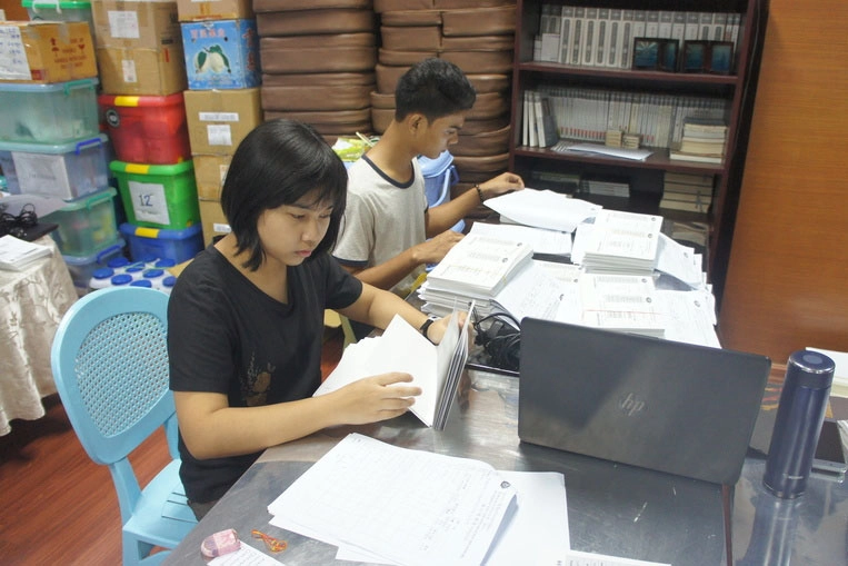 2019年緬甸雨季豪雨引發多起水患,台灣、馬來西亞與緬甸志工組成稻種發放團,協助改善農民生活。溫星雨(前)將發放通知單依照村落進行分類。(2019/02/11;攝影:顏玉珠)