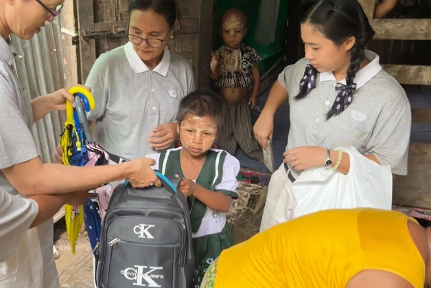 慈濟志工在緬甸曼德勒關懷時,接獲鄰里通報特殊個案,隨即展開訪視。圖為溫星雨(右)為孩子換上新校服、新書包,並陪伴前往學校上課(2025/08/12;圖片來源:花蓮本會提供)