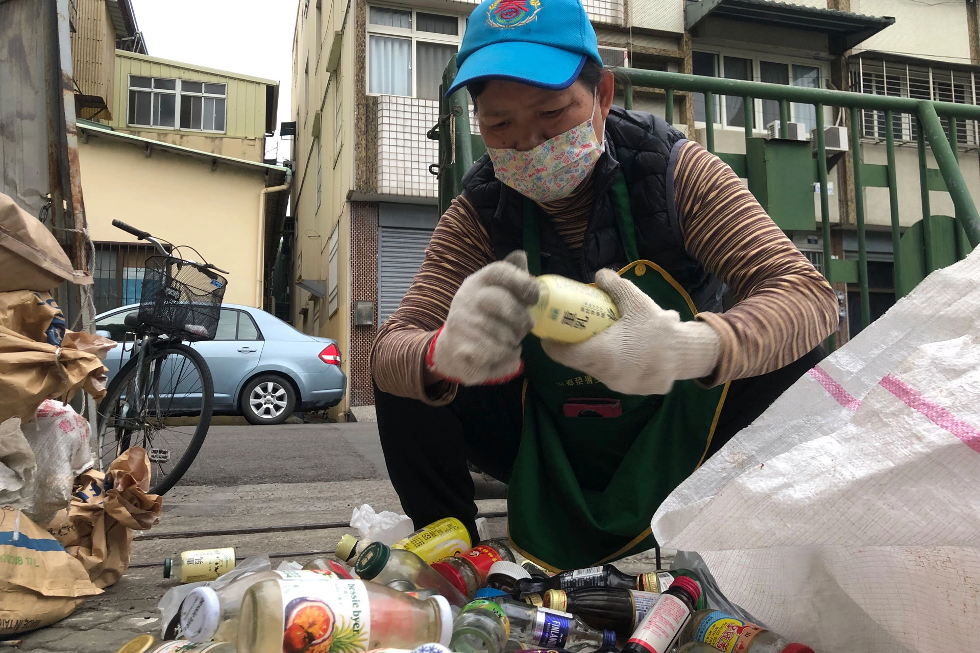 烏日環保站一週開六天,施香蘭利用自己的時間承擔玻璃罐分類。只要有空,即使只有半個鐘頭,她也會騎著十幾分鐘的車到環保站,不讓玻璃罐累積成堆。