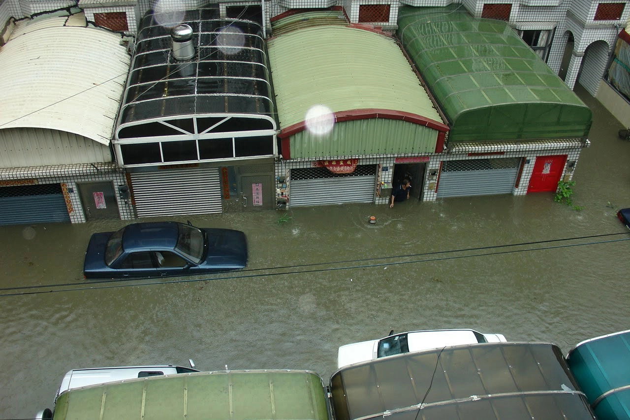 卡玫基颱風帶來豪大雨,家家戶戶都被積水淹沒,車輛也泡在水中。(攝影:陳榮豐)