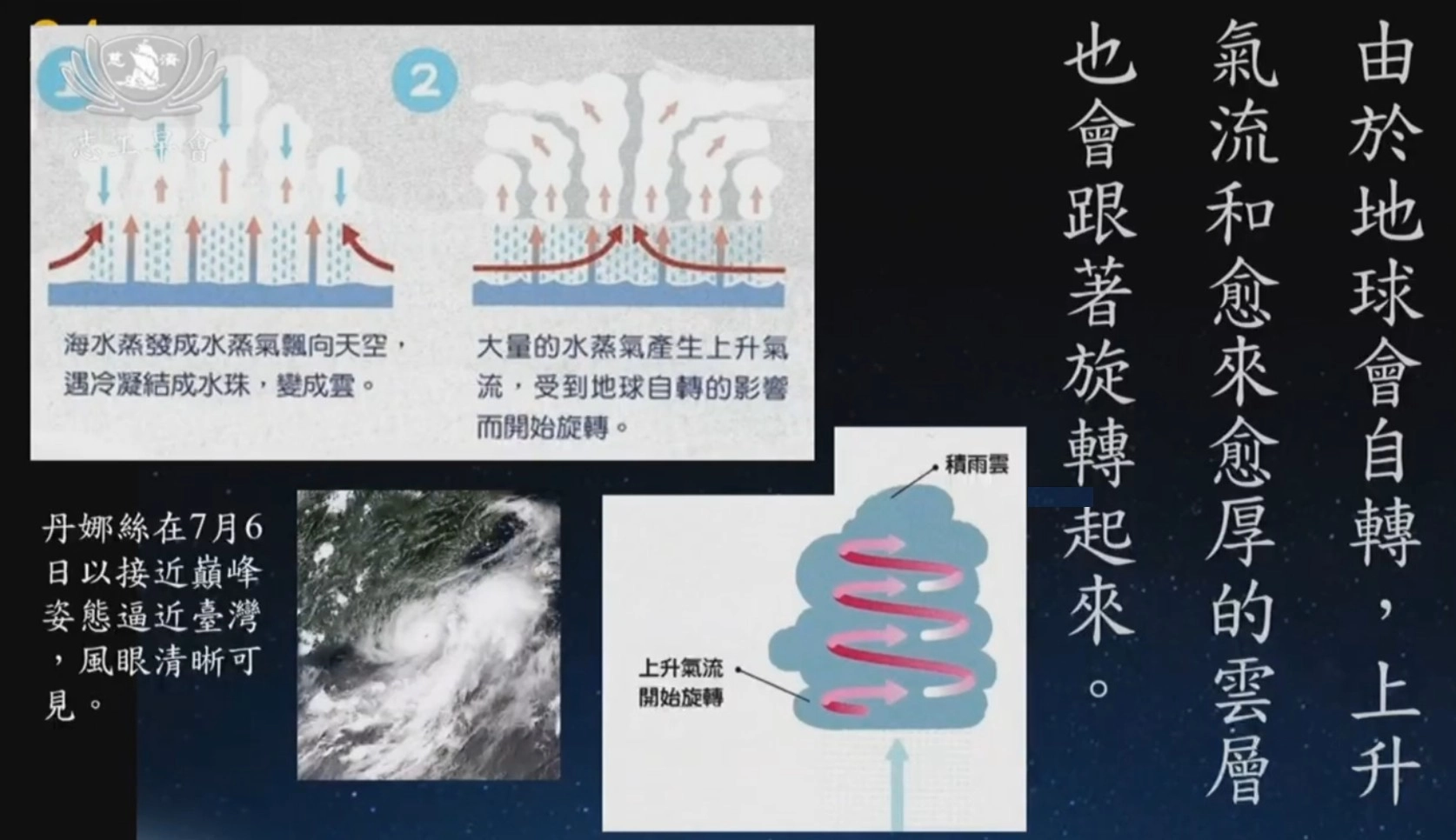 颱風眼在旋轉中不斷吸收水氣,雲層越來越厚,猶如劇烈旋轉的漩渦,最終形成強大的颱風。(圖片來源:截取自釋德(耒曼)簡報)
