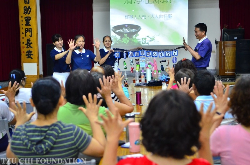 台中市后里區環保推廣活動,為社區民眾規畫一系列的環保課程,林淑嬌師姊(站左2)教大家念環保十指口訣,以了解回收物的分類方式。(攝影/蔣妙卿)