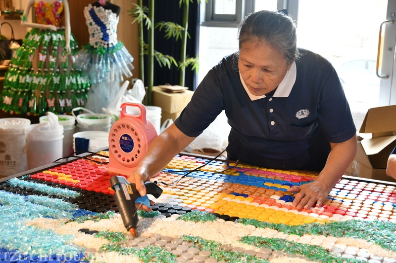 臺中靜思堂慈濟環保30周年布展前置作業。林淑嬌(慮璦)師姊拿著膠槍,將鬆動的瓶蓋做補強固定。(攝影/簡明安)