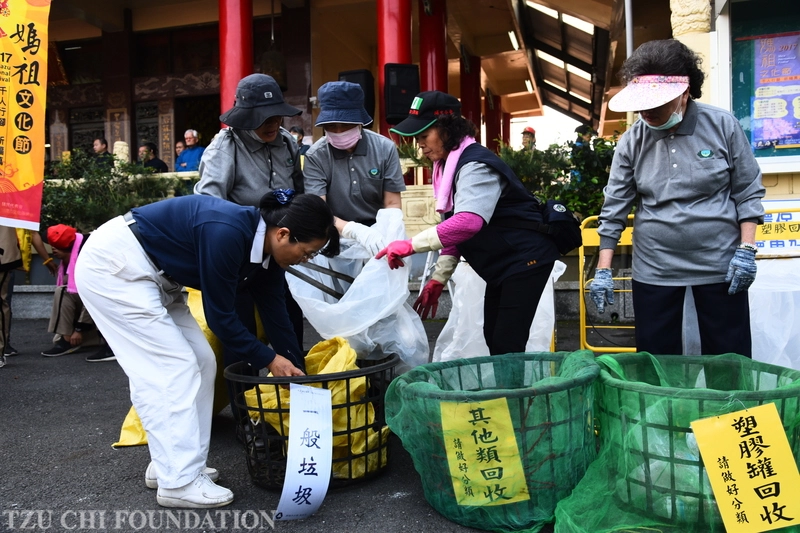 南投埔里媽祖文化節千人繞境萬人祈福活動,慈濟在定點設置資源回收處,宣導環保回收分類。周惠如(左)與志工們在現場整理回收物。 (攝影/潘常光)