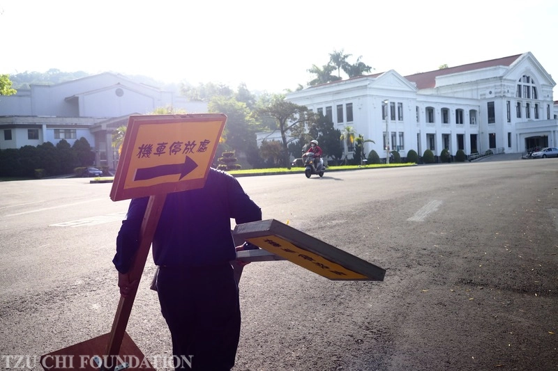 南投中興新村佛誕日浴佛典禮前置作業,時任草屯和氣隊長的許昆龍校長親力親為帶動布置。 (攝影/簡宏正)