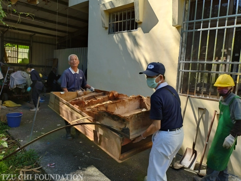南投縣埔里鎮照顧戶居家清掃,賴錦文與志工將朽壞的床架抬到屋外的草地,讓它自然腐爛。(攝影/施金魚)