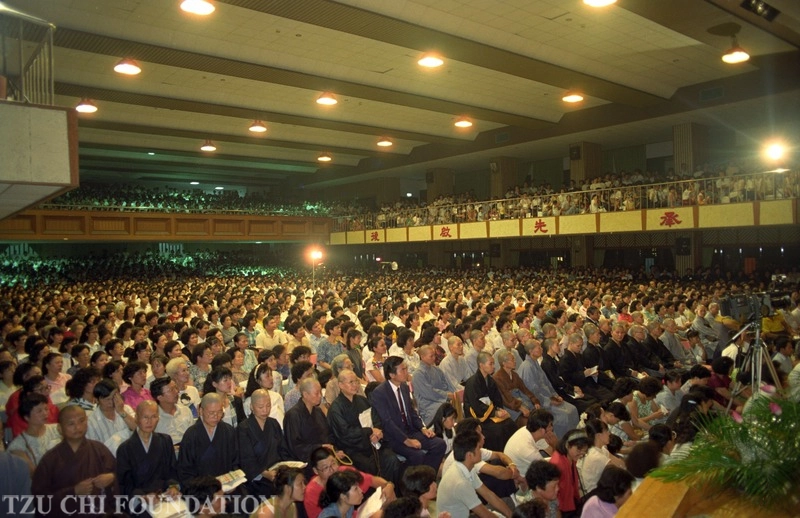 吳尊賢文教公益基金會舉辦「吳尊賢社會公益講座」,證嚴上人應邀巡迴演講,呼籲大家「用鼓掌的雙手做環保」。民眾踴躍參與,現場座無虛席。 (攝影/黃錦益)
