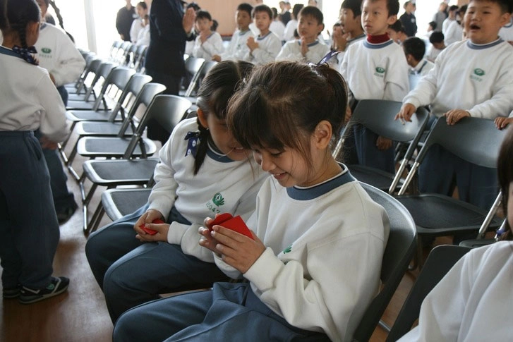 台南慈濟中小學歲末祝福,小朋友好奇地觀看福慧紅包的內容。(2007/12/08;攝影:黃裕銘)