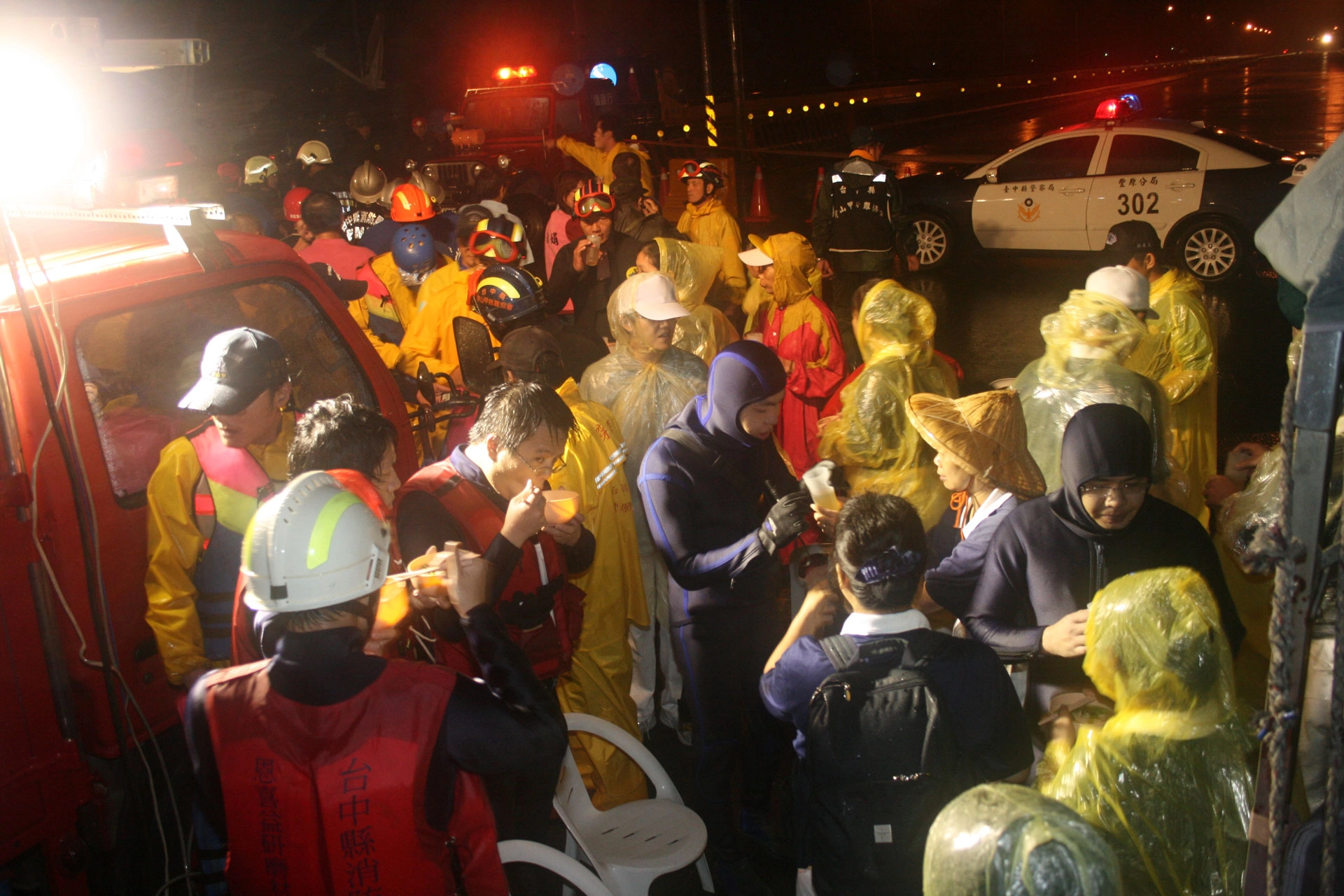 志工陳明珠在第一時間抵達現場,已有一百多位警察、消防人員與救難團體投入搜救。「救難人員從水中上來後,有的冷得直發抖,幸好豐原和后里兩地的志工準備了熱熱的薑湯和麵食,幫大家驅寒。」