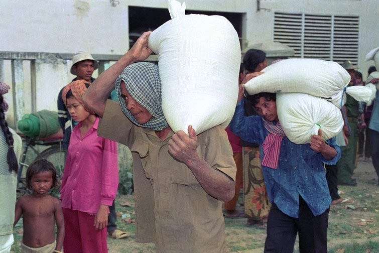 慈濟志工赴柬埔寨發放大米與穀種,村民紛紛搬運領取的大米返家。(1994/12/06;攝影:黃錦益)