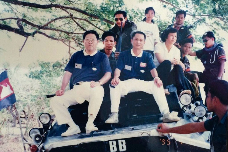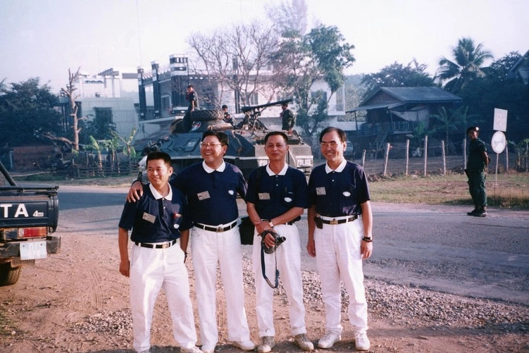 羅明憲師兄(前中)、陳金發師兄(前左)至柬埔寨馬德望省勘災,搭乘坦克車穿越遭軍隊封鎖的村莊。(1995/01/01-31;圖片來源:謝明勳提供)