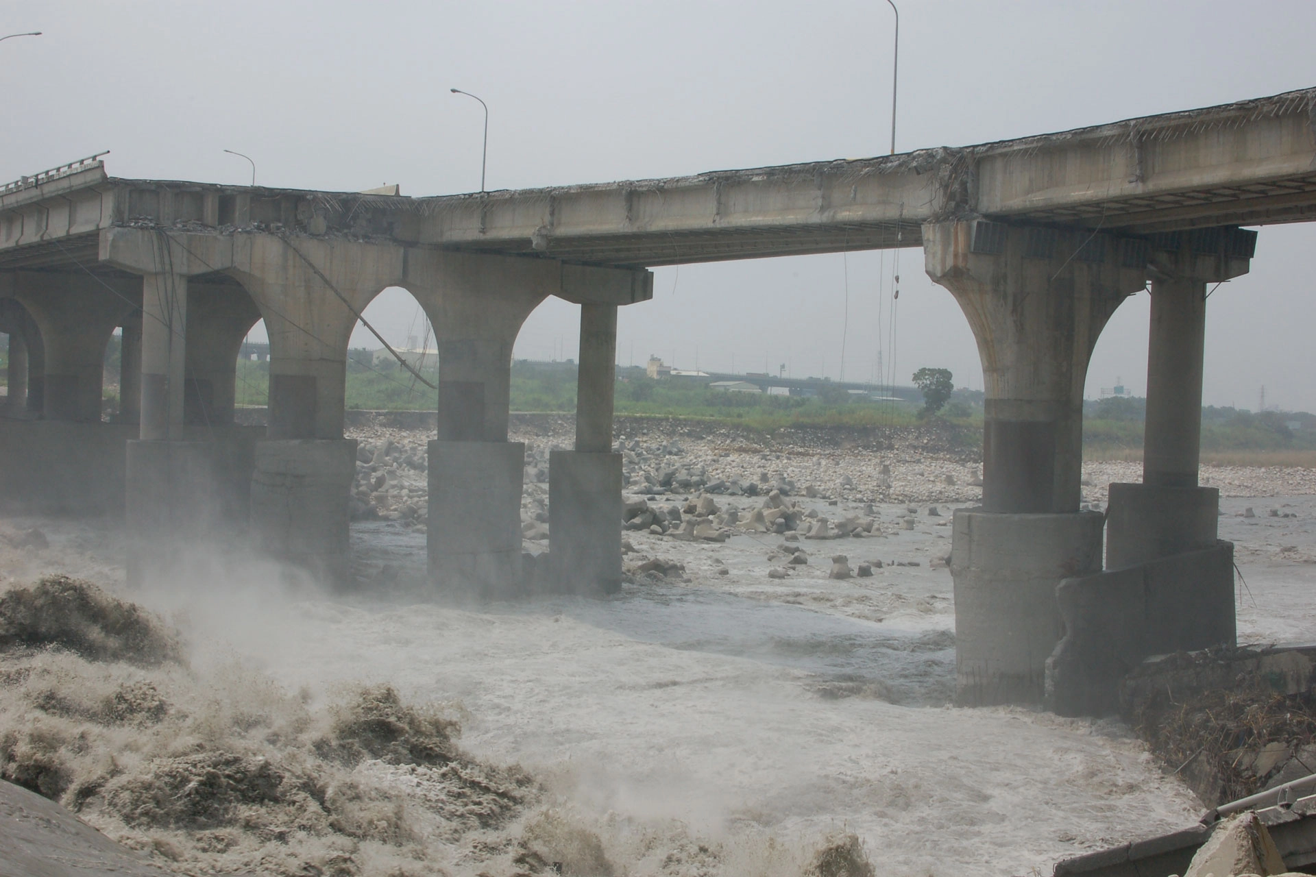 后豐大橋寬闊的橋面崩塌入溪,上游山區偶有細雨,水勢湍急,遠眺景象令人怵目驚心。(攝影:陳聰霖)