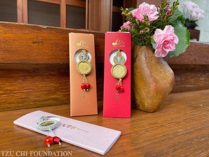 慈濟起家的五毛錢,結合刻有《無量義經》經文「靜寂清澄,志玄虛漠,守之不動,億百千劫」的水晶琉璃珠及相思豆,作為慈濟六十周年慶的結緣品,象徵弟子對上人的無上敬意與莫忘五毛錢的力量。 (攝影/顏婉婷)