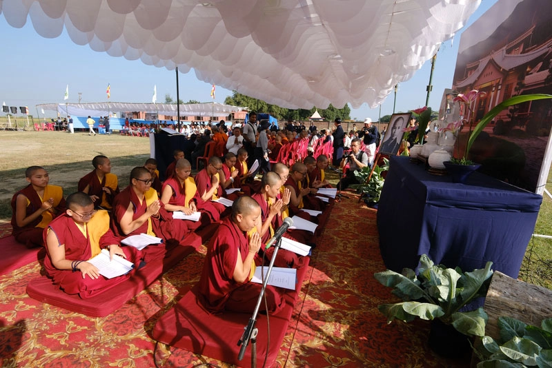 慈濟基金會援建藍毘尼悉達多小學的新校舍舉行動土典禮,十六位創古度母寺的比丘尼唱誦尼泊爾文的《無量義經・德行品》。(攝影:馬俊豪)
