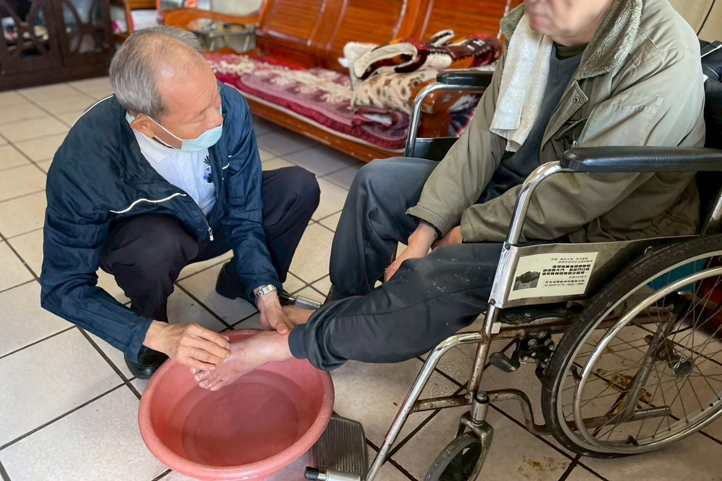 陳文德醫師問完診,協助個案以溫水洗腳,如當年侍奉自己的父母。(攝影:羅碧淵)
