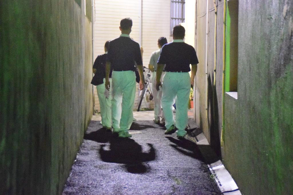 志工們在暗夜窄巷中穿梭,相攜共行訪視個案。(攝影:楊國華)