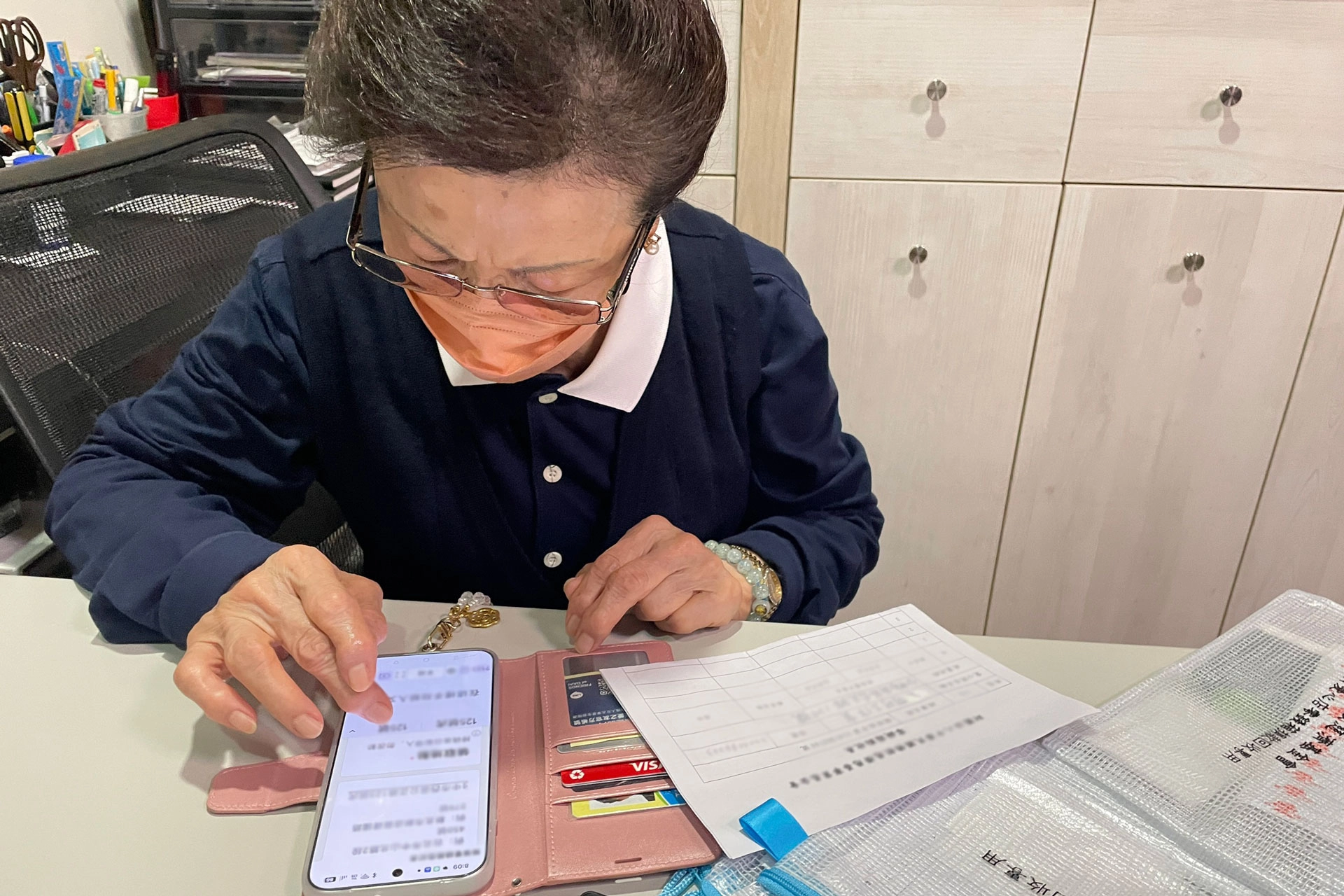 蕭桂蘭學習資深志工所傳授法門,鼓起勇氣向店家推竹筒,獲得店家共襄盛舉。(攝影:陳秀鷹)