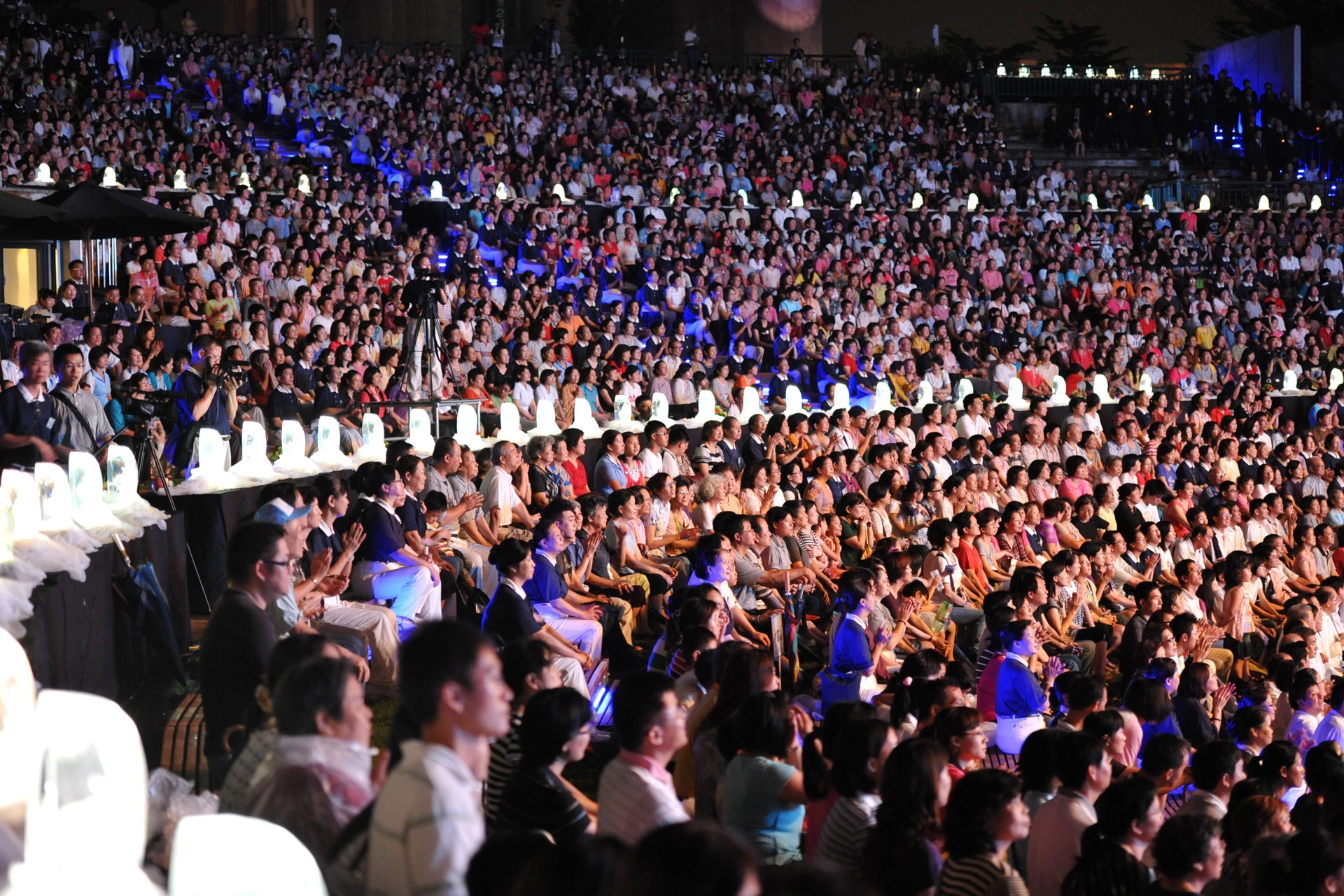 萬人參與「歡喜・感恩・七月吉祥」祈福會,準時在臺中市圓滿戶外劇場展開,此時雨也停了。(攝影:彭東整)