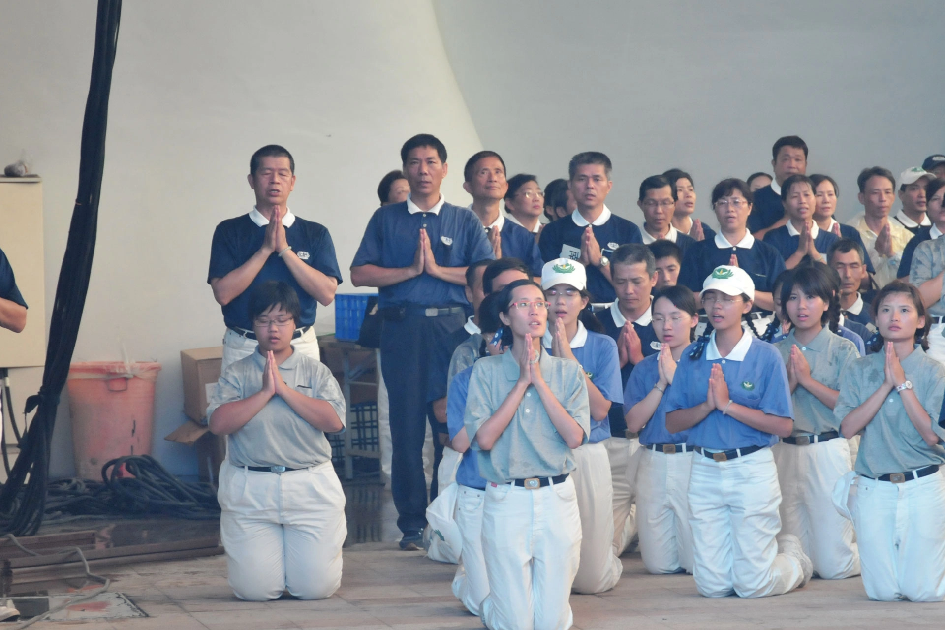 8月28日晚間六點多,我們在臺中巿圓滿戶外劇場,展開「歡喜.感恩.七月吉祥」祈福會,來自宗教界、企業界、醫護人員、學校等各機關團體,以及社區民眾,約一萬一千人參加。當場地布置完成後,老天爺卻沒賞臉,烏雲密布,宛如黑色天幕,並飄起毛毛細雨。活動幹事靈機一動,隨即召集現場數百位師兄師姊聚集在舞臺上,跪地虔誠地唱誦《祈禱》。