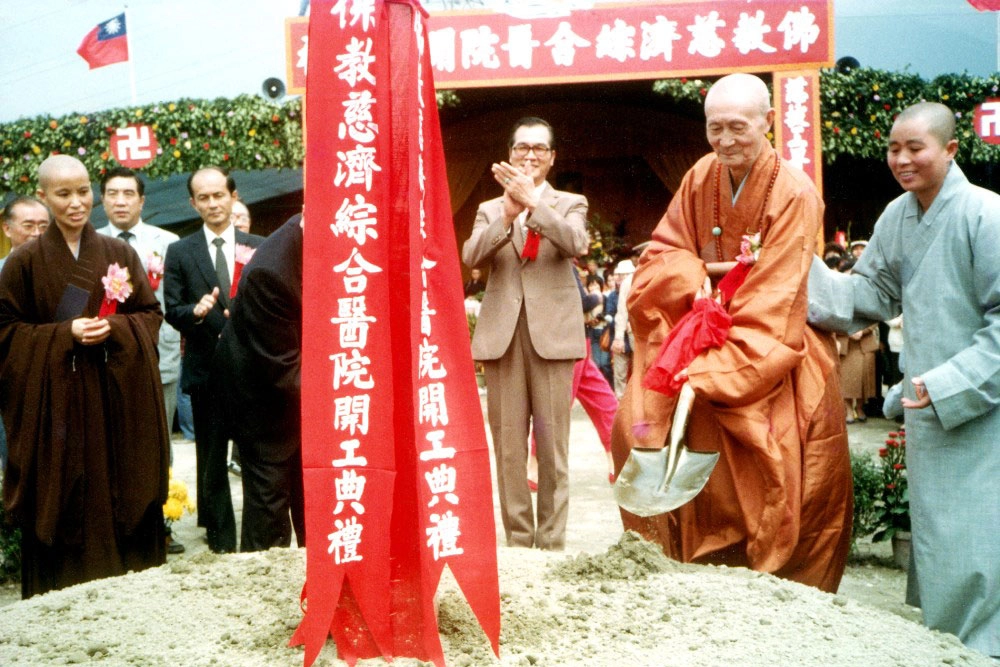 印順導師(右二)雖然擔心弟子證嚴法師(左一)身體孱弱,如何負荷籌建醫院的沈重壓力,但仍給予精神與實質上的最大支持。(1984/4/24;攝影:林瑛琚)