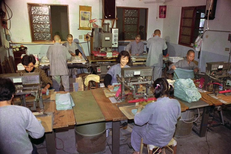 靜思精舍常住師父代工高週波嬰兒尿褲。在花蓮慈濟醫院籌建期間參訪者增加,常住開銷遽增,師父們常趕工做到晚上十二點。(圖片來源:黃錦益師兄翻拍)