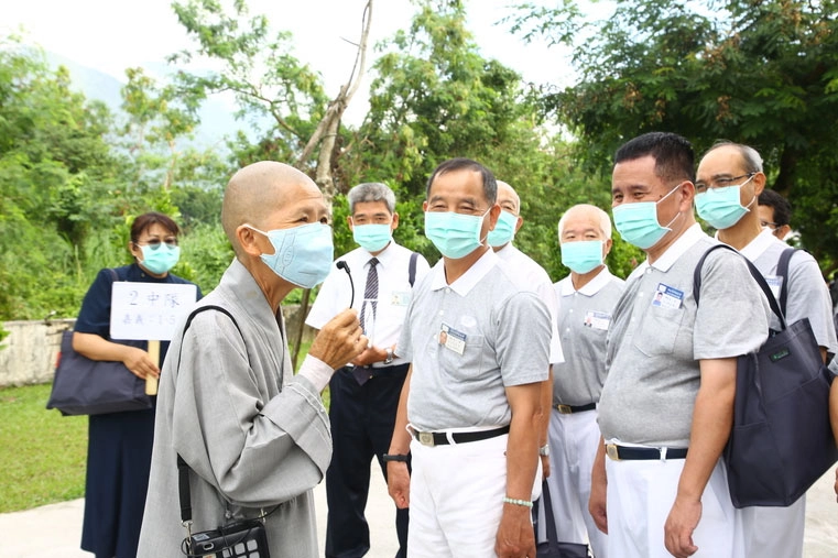 德安師父帶領學員進行精舍巡禮;精舍有如一佛典,一景一物無不在說法。(攝影:王翠雲)
