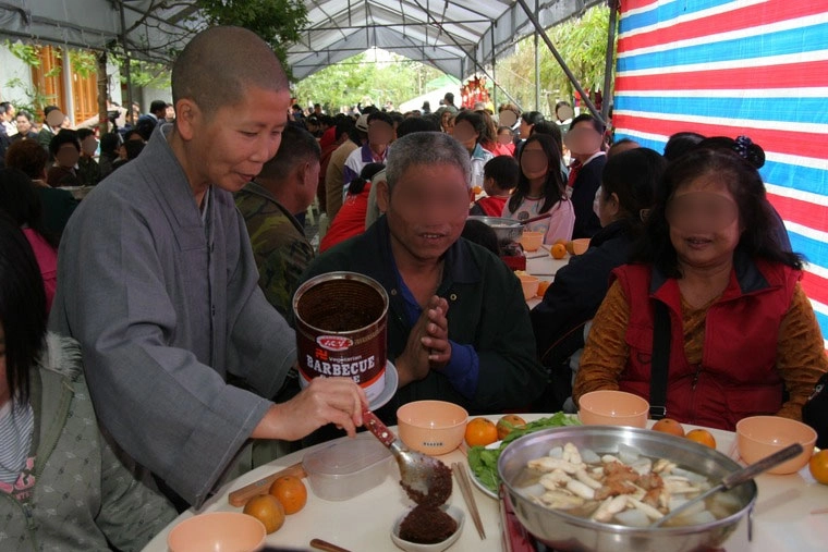 歲末之際,慈濟基金會邀請長期關懷的照顧戶圍爐話家常,德安師父走訪各餐桌,為用餐者添加所需的食材與配料。(2006/01/22;攝影:葉守仁)