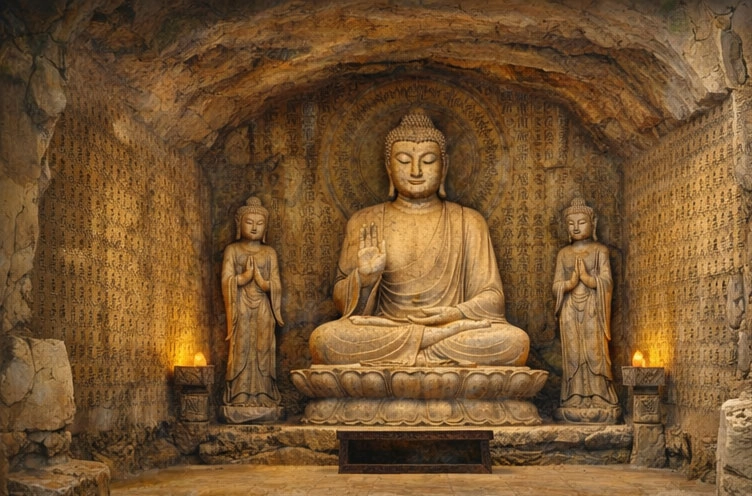 響堂山石窟大佛旁側刻有《無量義經》,整體氛圍莊嚴,無論從藝術價值或書法研究而言,皆堪稱難得的藝術瑰寶。