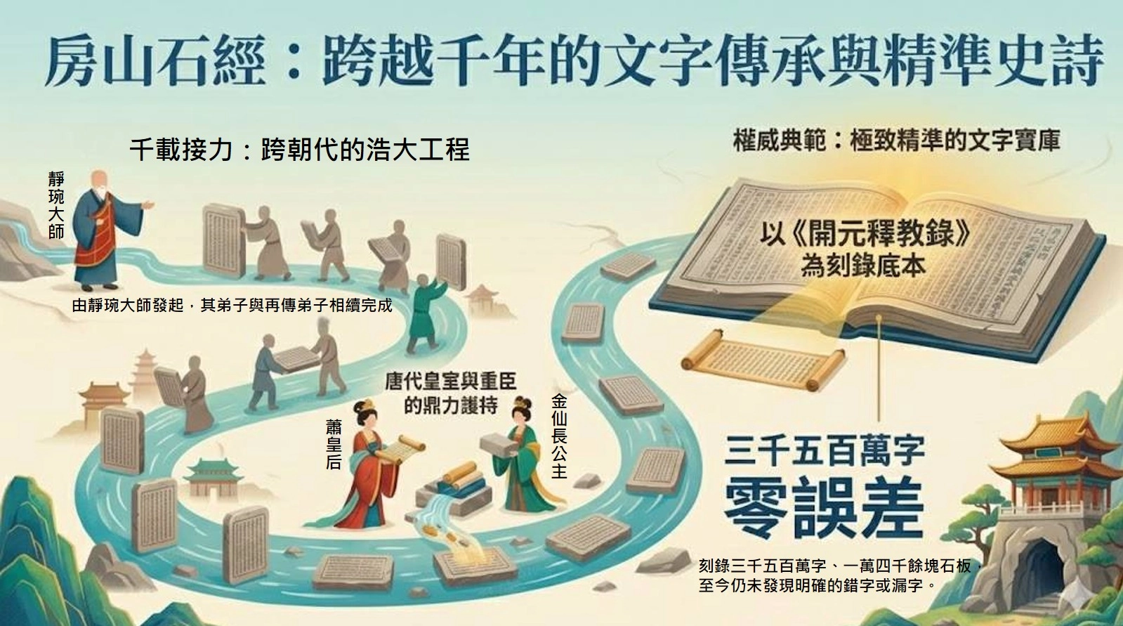 其中,金仙長公主的護持尤為關鍵。唐開元十八年(西元730年),智昇法師完成編纂《開元釋教錄》,此錄至今仍被視為極具公信力的重要藏經,全書四千卷,並敬呈皇上。金仙長公主隨即請求唐玄宗將此部經錄賜予房山石經,作為刻經的底本。