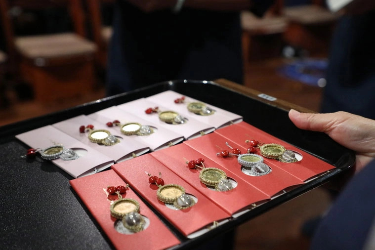 慈濟即將邁入一甲子,莫忘五毛錢竹筒歲月的慈善精神;志工以早期臺灣五角硬幣,搭配中國結編成吊飾,傳承那分精神。(攝影:陳靜惠)