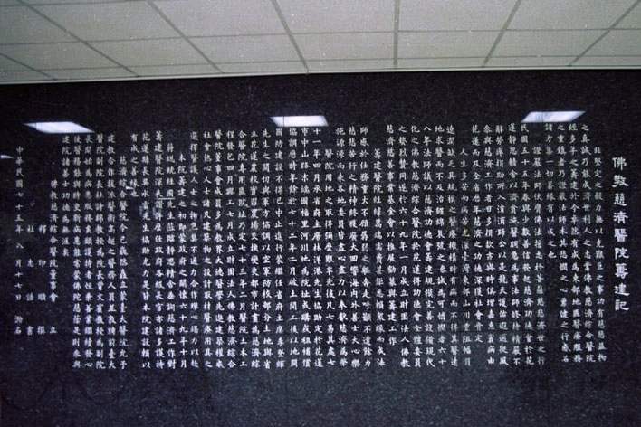 位於花蓮慈濟醫院大廳右側的「佛教慈濟醫院籌建記」石刻紀念碑銘,由印順導師撰文,刻畫證嚴法師以堅定毅力創建醫院的宗旨與艱辛歷程。(1986/08/17;圖片來源:花蓮本會提供)