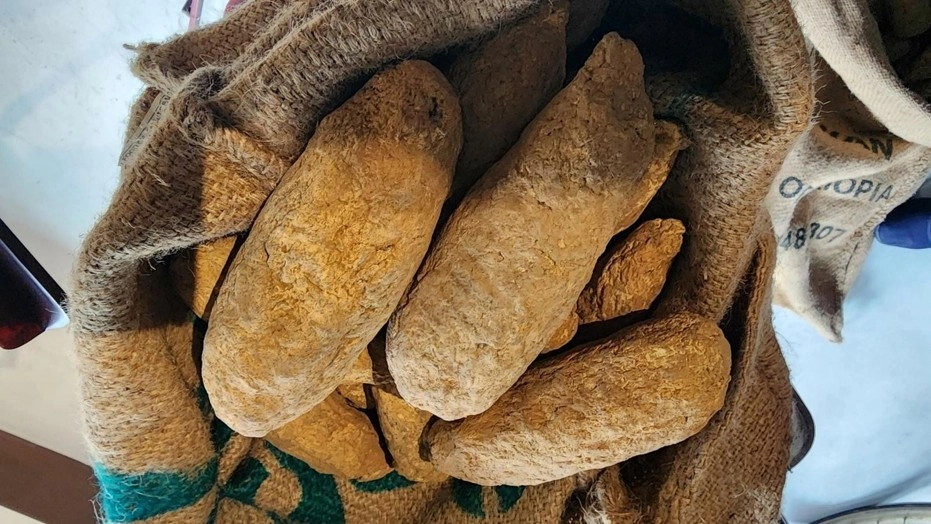 展區展示的仿真地瓜,是榮忠師兄以舊報紙紙漿與花蓮泥土用心製作的見證。(攝影/鄭春玉)