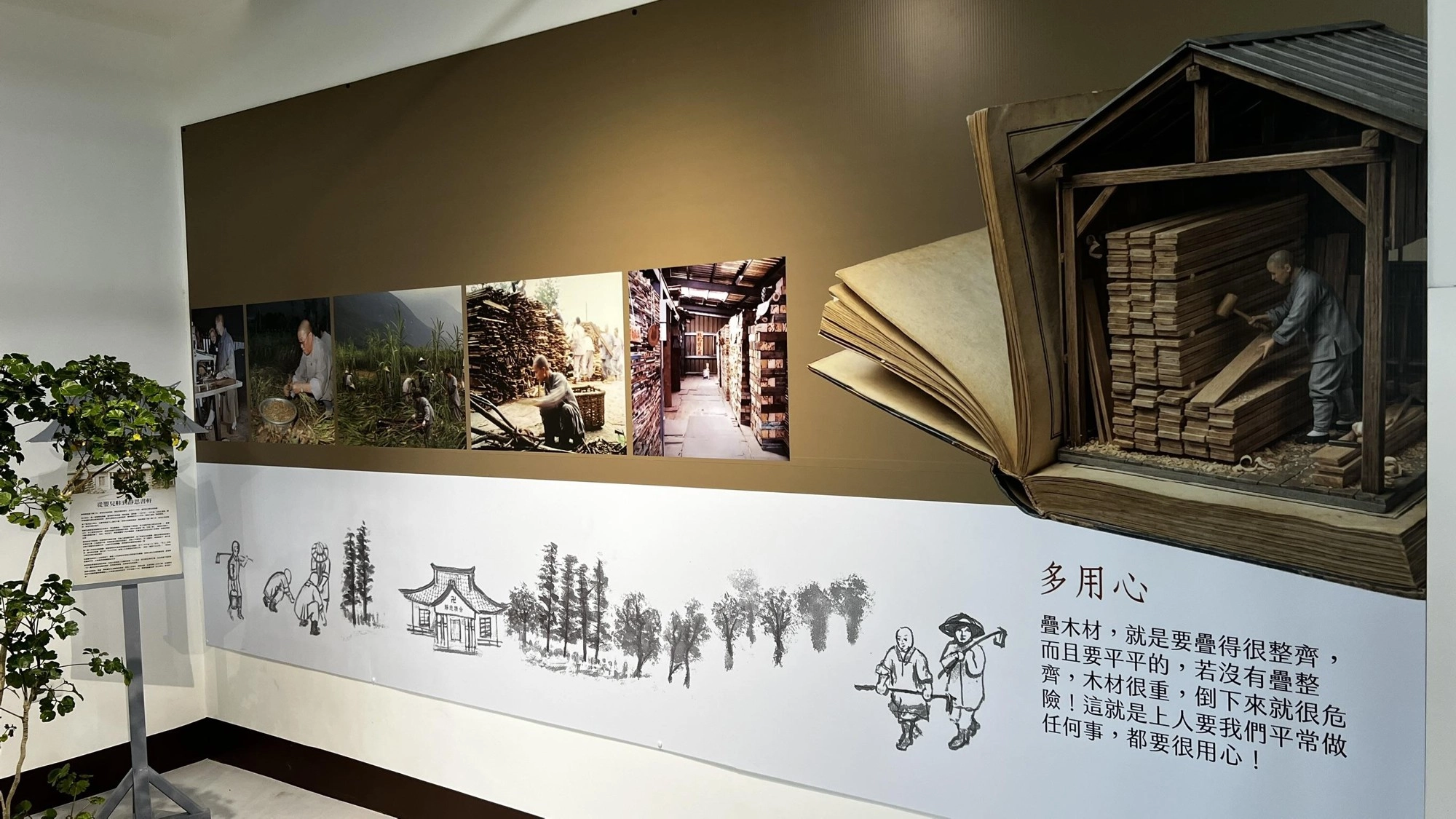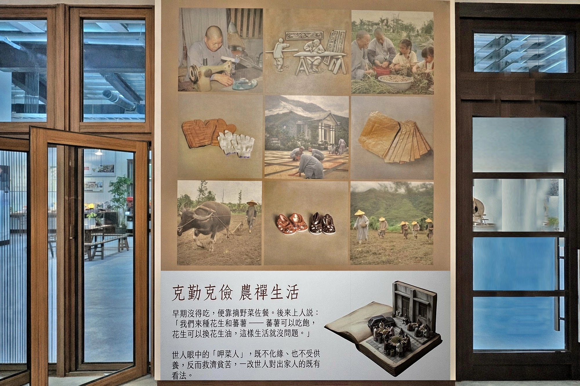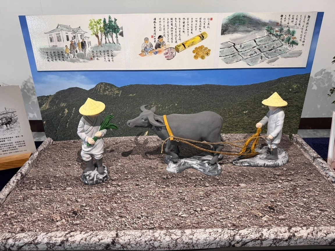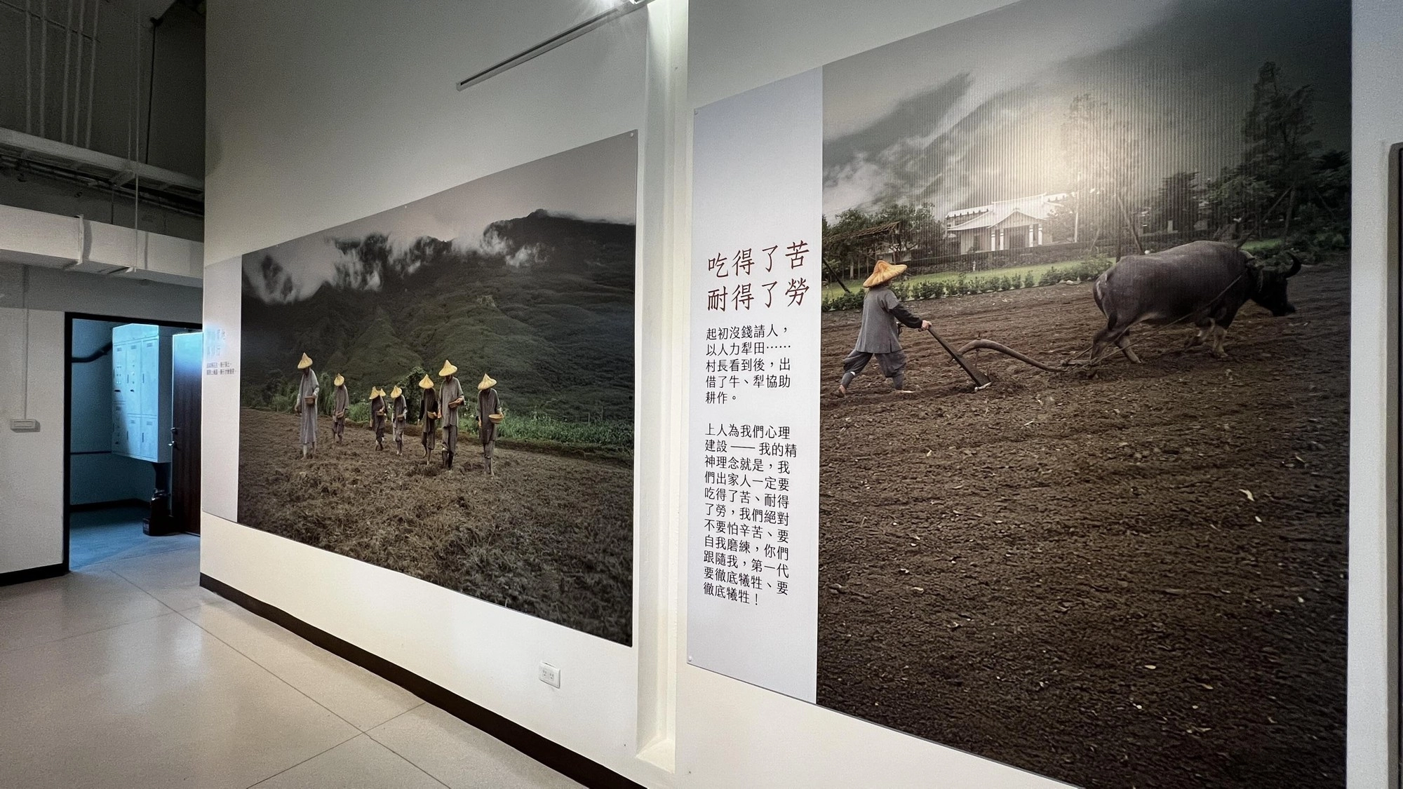 在展覽區的「看圖說故事」中,我們可以看見許多動人的歷史畫面。早期耕作缺乏人力與工具,慈師父甚至親自下田充當牛隻拖犁。後來雖借到了牛,但牛隻不肯動,慈師父不忍鞭打,看到旁邊的甘蔗,就抓了一把甘蔗葉給上人。上人拿著甘蔗葉在前方誘引,牛為了吃草就會緩緩前行。