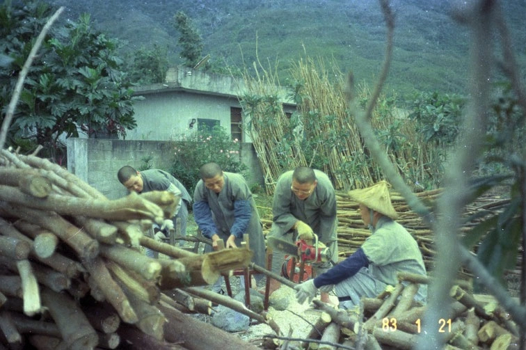 德融師父(左二)分享,上人常以善巧方便教導弟子,有時看似責備資深弟子,實則借力使力,引導年輕弟子明白受教之道。(1983/01/21;圖片來源:花蓮本會提供)