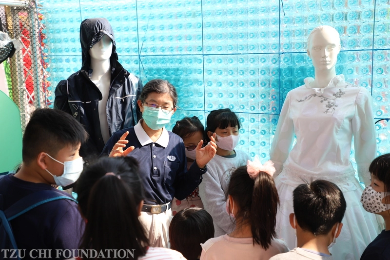理念向下扎根,邱淑姿為臺中梧棲中正國小學生介紹展場陳列的鞋子、衣褲......全是利用四、五百年都無法分解的寶特瓶做成的生活用品。(攝影/邱百豊)