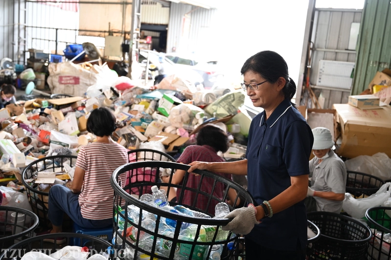 臺中市北屯三區大型環保回收日,邱淑姿師姊將資源回收物搬到定點,再由志工進行寶特瓶分類。(攝影/簡明安)