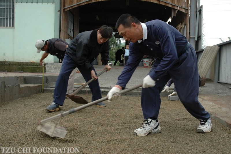陳榮忠師兄(右一)捐出土地,做為台中龍井共修處「回歸竹筒歲月,樹立慈濟新年輪」志業展展出場地和共修場所,並親自參與擴建工程。(2007/04/06攝影/陳榮照)
