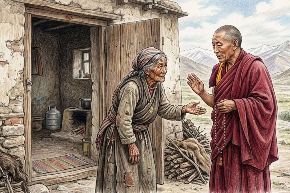 老太太見喇嘛站在門前,趕緊出來禮拜,並請喇嘛入內喝水。喇嘛一看,竟是一位尋常婦人,心中非常納悶,便問道:「老太太,您在這裡住多久了?」老太太回答:「很久囉!」