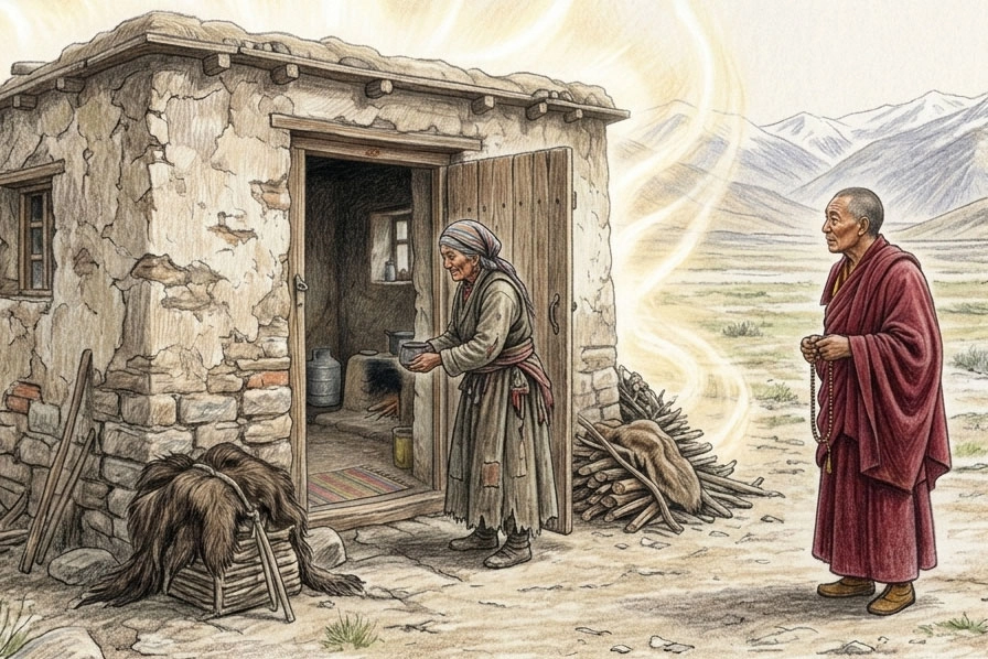 喇嘛稍坐片刻,便告辭上路。走上山路一段時間後,他回頭再望那間茅草棚,卻不見先前的赫赫光明,心中大驚,頓時醒悟:「是我錯了!是我影響了她!信心與專注,比咒音準確更為重要。」