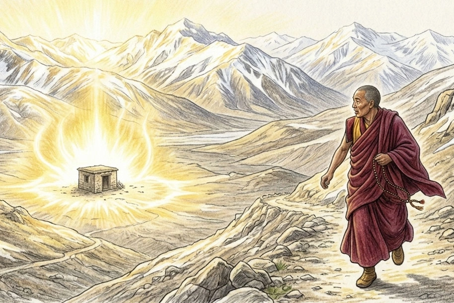 有一天,一位西藏喇嘛途經此地,遠遠便看到這間小茅棚,四周大放光明。他心想,此行經過諸多地方,未曾見到真正的修行者,眼前此景,屋中必定住著得道高人。於是,喇嘛臨時改變路線,不辭繞道下山,尋訪這間茅草棚的主人。