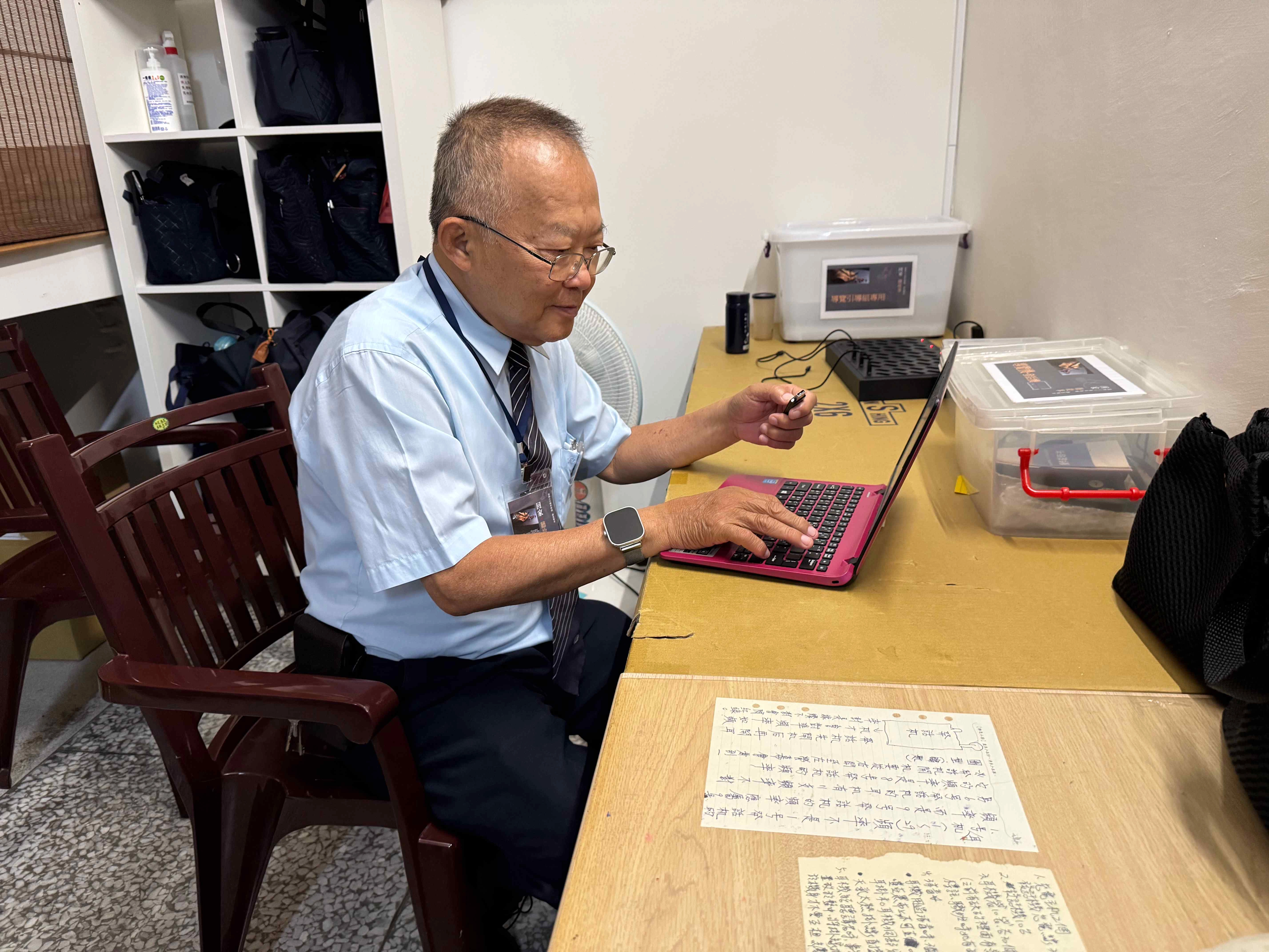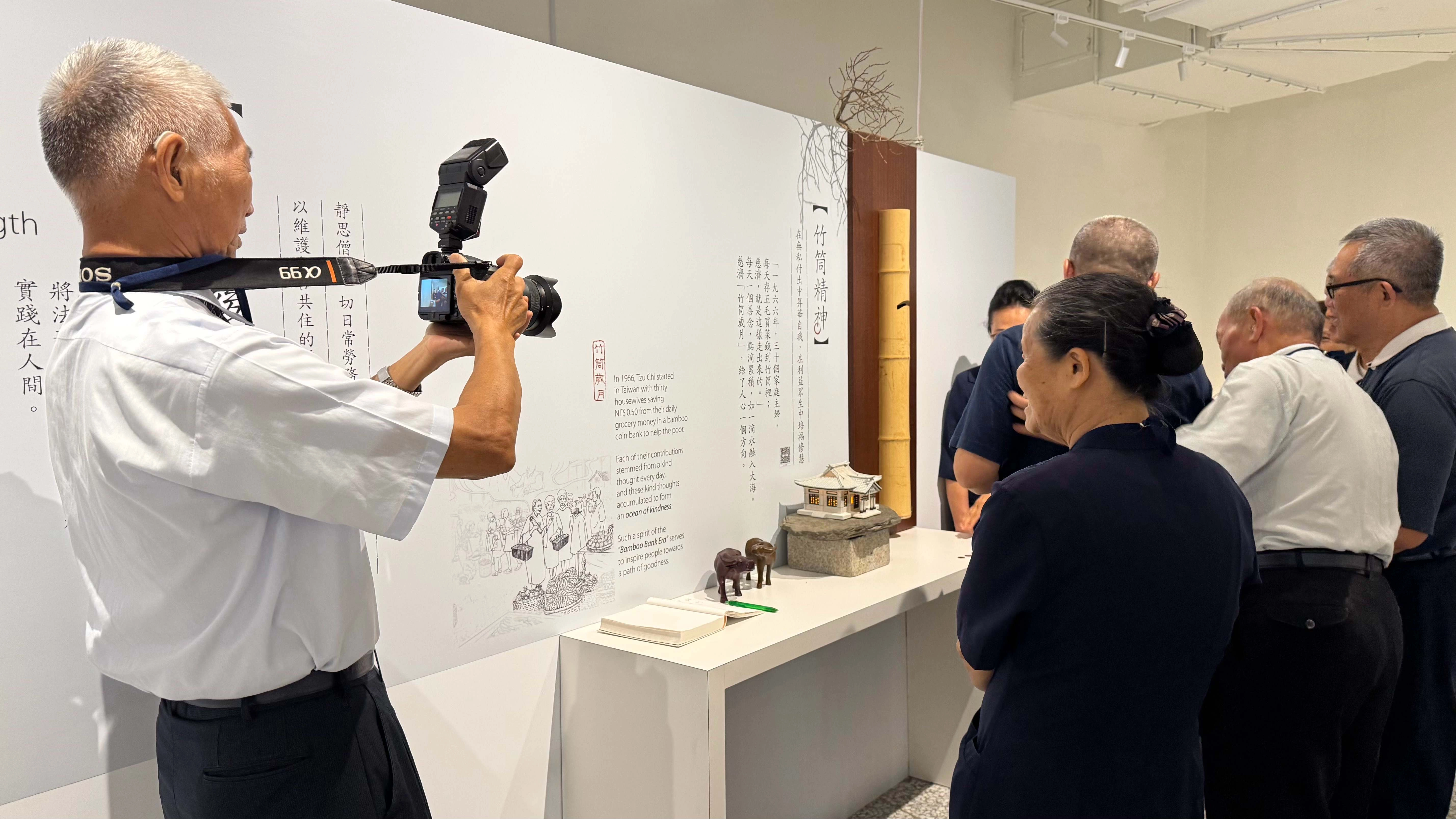 除了白天的導覽與夜裡的紀錄,幕後還有一群默默付出的身影。這群夥伴,有的是慈濟的資深志工,有的是退休的老闆或老師,但在展館裡,人人都放下身分,以謙卑之心投入。