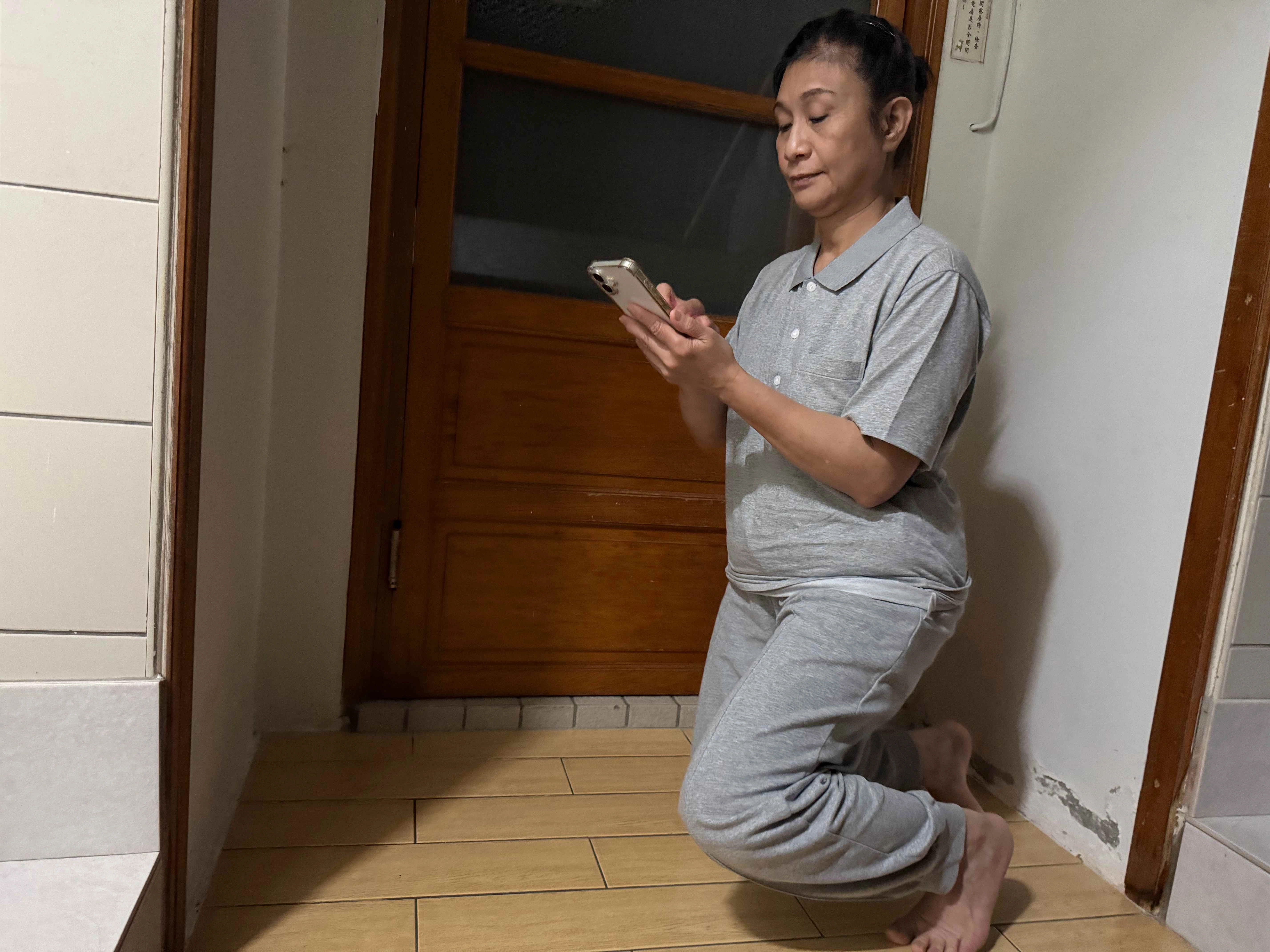 李明荶在精舍安板後,為了不干擾室友,到寮房的廁所一角,藉著微弱燈火完成當日的心得紀錄。(攝影/江美芳)