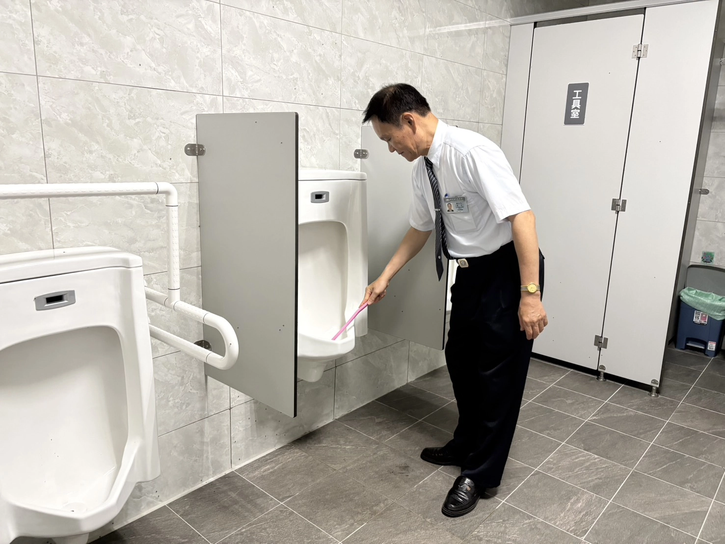 陳立宗與李明荶夫妻倆分工合作,將最粗重的環境清潔視為共同的修持,合力將廁所刷洗得光潔如新,展現出最踏實的幸福身影。(攝影/李明荶)